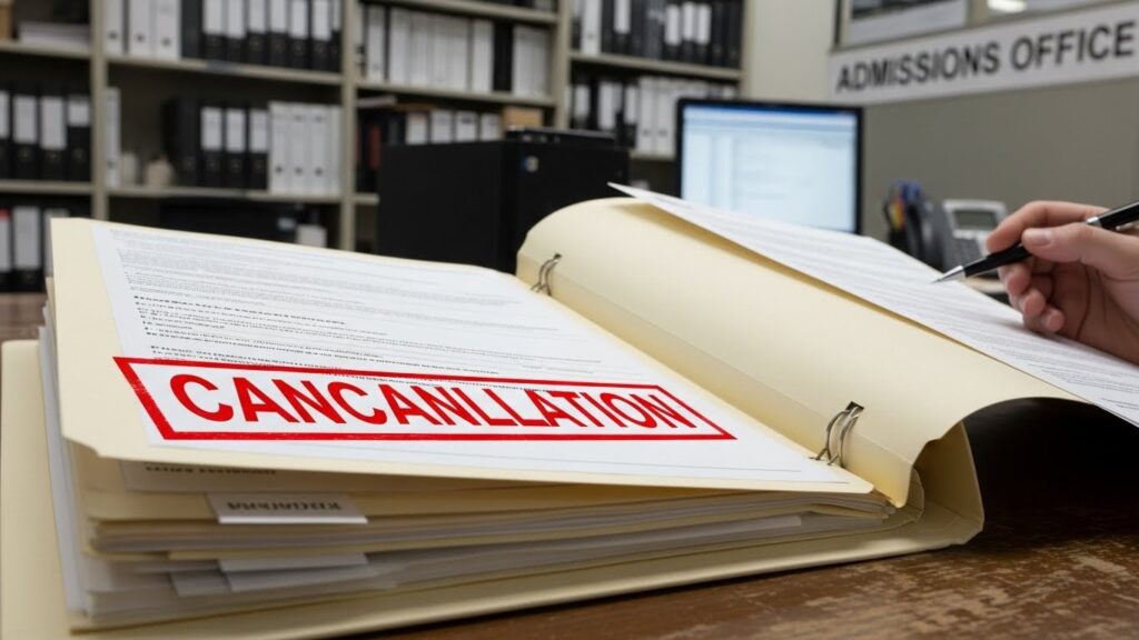 Student applying for cancellaon of admission personally or through guardian, on a non-judicial stamp paper worth Rs. 50, duly aested by an oath commissioner. Reasons for the cancellaon shall be given to the instuon. Principal may cancel his/her admission on recommendaon of the concerned commiee.